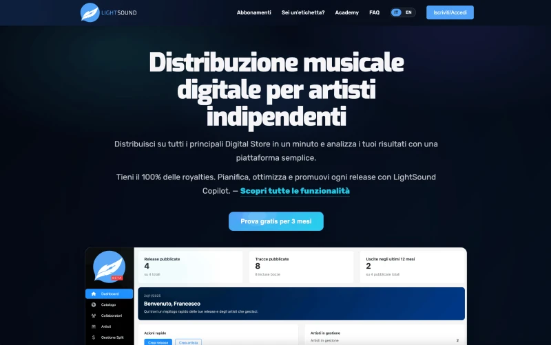 Gestisci la tua carriera e la distribuzione musicale in un'unica piattaforma data-driven e supportata dall'AI.
