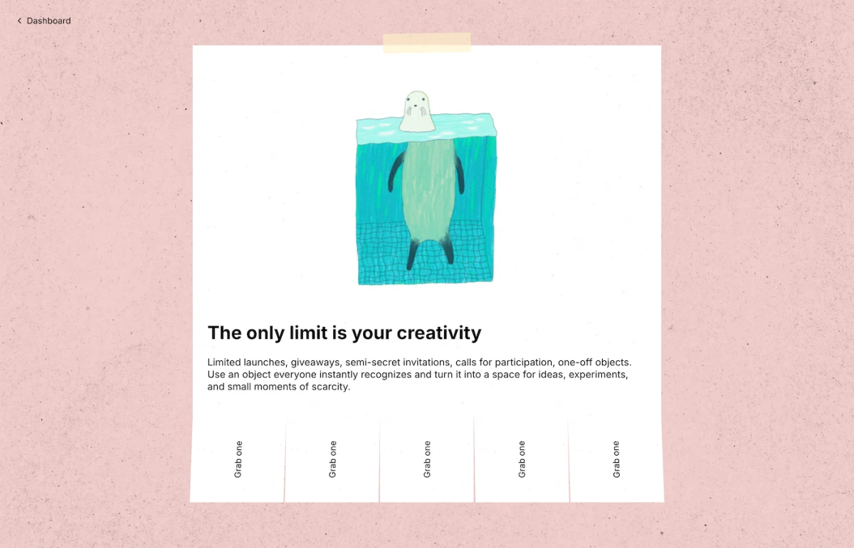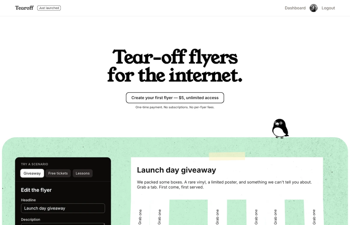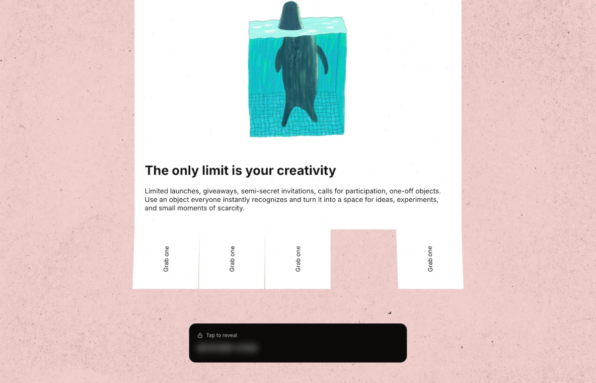 Porta il classico volantino cartaceo con linguette staccabili sul web. Crea un volantino digitale, aggiungi linguette con codici sconto, messaggi nascosti, link di accesso o contatti, e condividilo tramite un unico link. Quando qualcuno prende una linguetta, scompare per tutti.