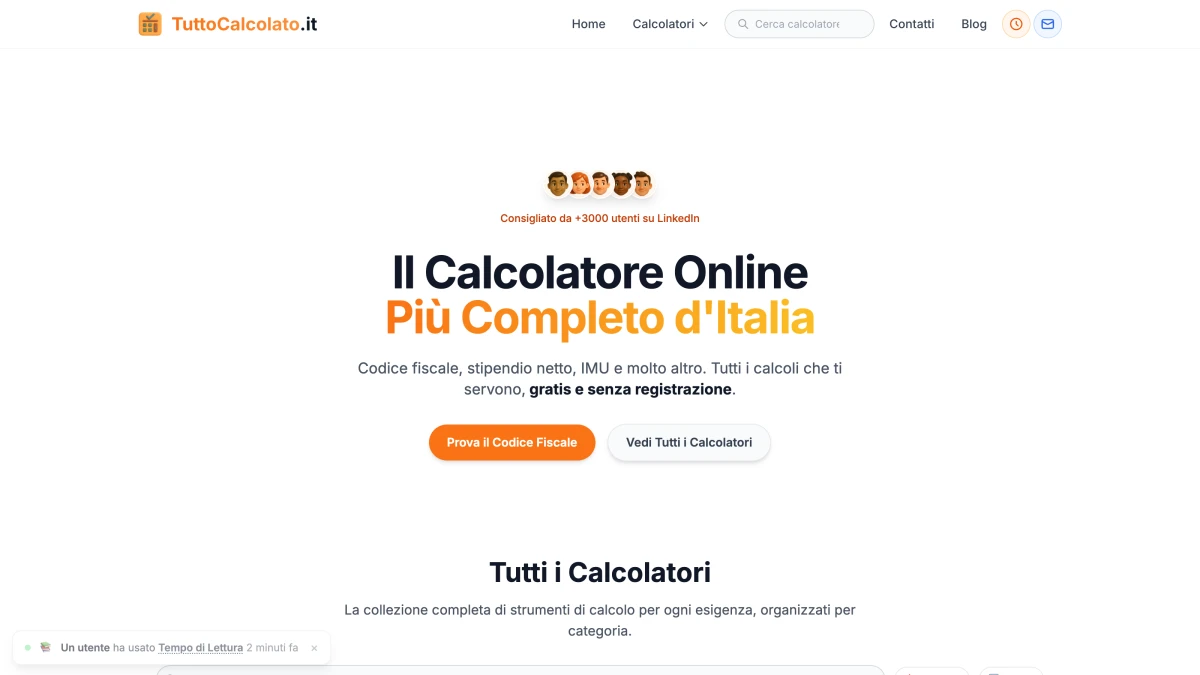 Una piattaforma che offre oltre 60 calcolatori gratuiti e senza registrazione: stipendio netto, tasse, mutui, salute, conversioni e molto altro, con risultati immediati, privacy totale e zero pubblicità.